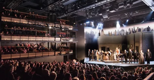 The auditorium, designed in collaboration with London Theatre Company’s technical and creative teams and stage engineering manufacturers, was made and tested offsite in modular form before being erected as fully coordinated, finished components in the existing building shell.