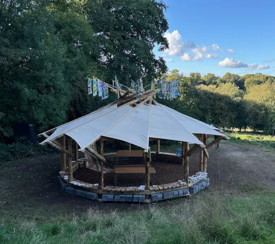 Momentum collaborated with Carpenter Oak to develop structurally complex forest shelter in Wokingham, made primarily from green larch and green oak. The shelter was constructed for the Forest of Imagination, an event featuring workshops and art installations for schools.