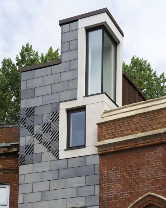 The new building is made of glazed terracotta, bringing the luminous quality of the interior to the outside, and giving presence to the building along its narrow street frontage.