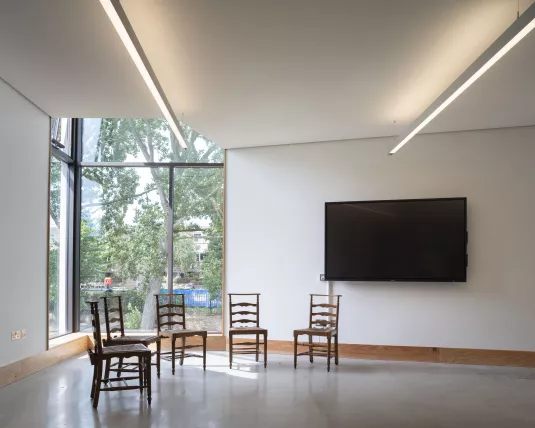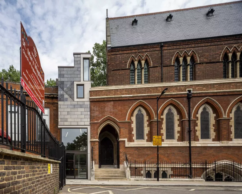 This project extends the Grade I listed church of St Mary Magdalene in Paddington. A new building to the west end of the church provides a café, education room and offices as well as access to the church undercroft which is converted into a performance space.