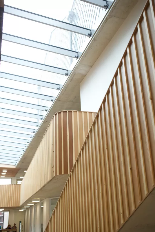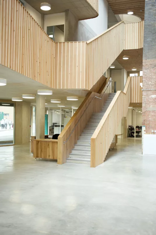 The new building’s foundations are piled. The superstructure consists of flat slabs, with soffits remaining exposed in the final works. GGBFS cement replacement has been specified to minimise the frame’s embodied energy.