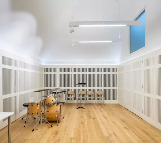 It provides a much needed space for rehearsal and performance, a series of music practice and teaching rooms, a seminar room with space for 24 pupils, a music library, a recording control room with facilities that will enable the college to offer Music Technology at A level, a percussion and rock room and associated administrative, technical and storage spaces.