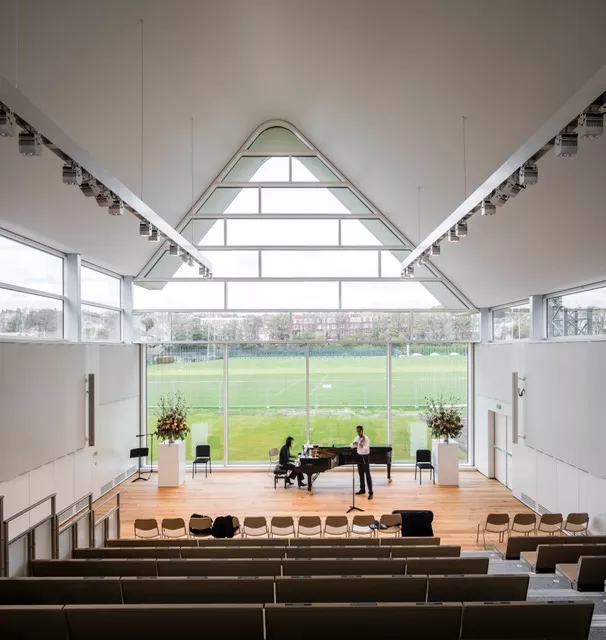 Located at the very heart of the college campus, the Music School building boasts a dramatic double-height recital hall with a seating capacity of 150.
