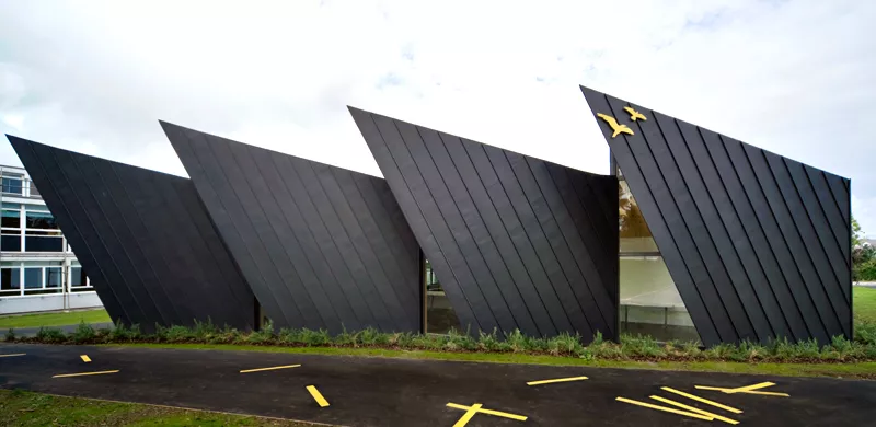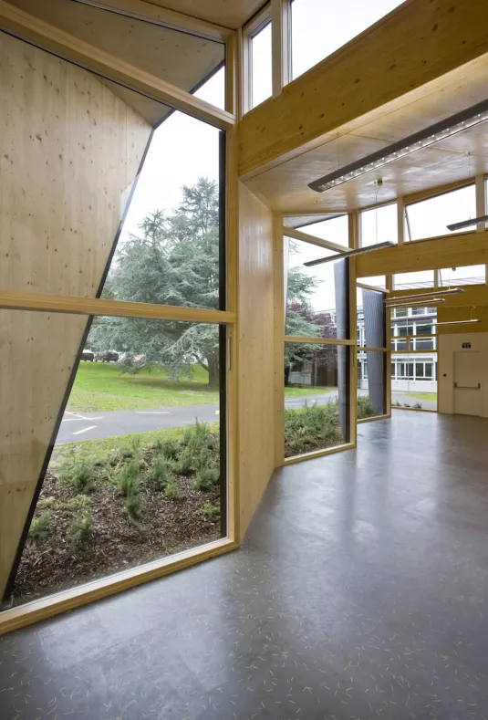 The striking new extension was constructed from trapezoidal cross-laminated timber panels which were weather-proofed with a zinc rain-screen. Internally, the timber was left unfinished, making a significant contribution to the building’s insulation.