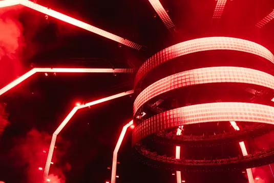 The stage makes use of three circular video screens which were supported from the roof as the main rigging load. In total, this arrangement weighed 6.5 tonnes.