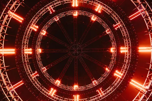The structural elements of the stage are arranged in a dodecagon. There are 12 truss towers, connecting to 12 roof beams, which all converge into a bespoke central hub.