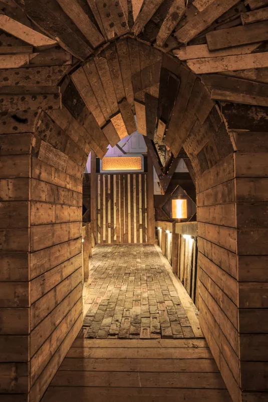 Made from recycled materials, including doors from Easton's Greenbank chocolate factory and wood from the Prince Street swing bridge, it was open for 24 hours a day across 24 consecutive days and involved over 2,500 performers.
