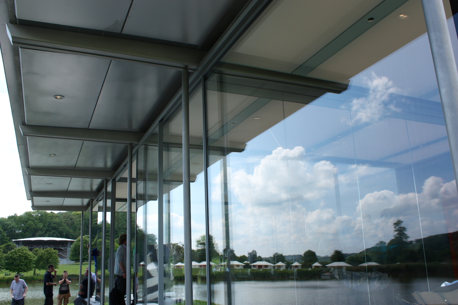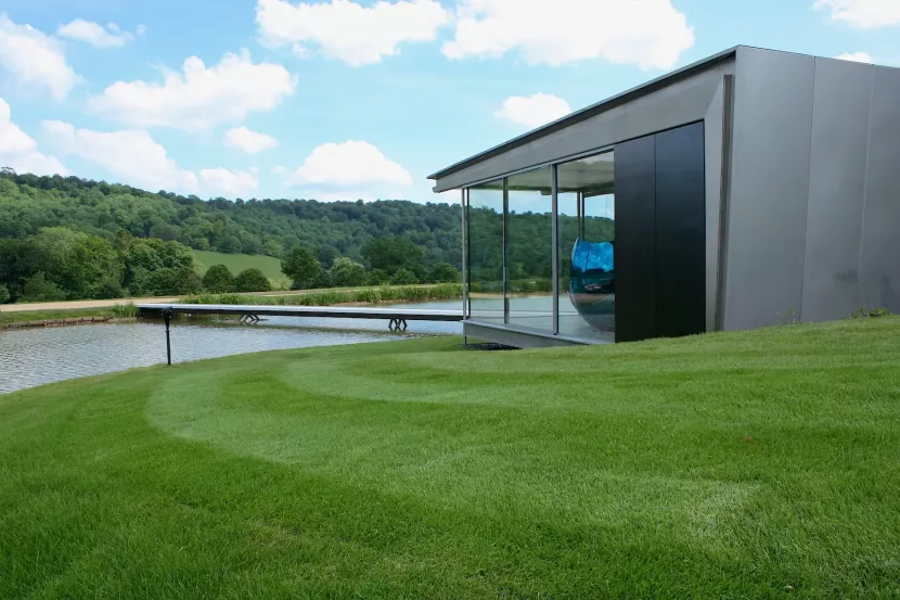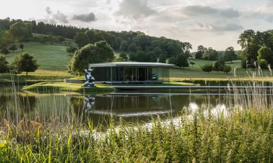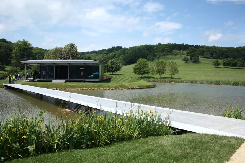 A simple footbridge links the main grounds to the pavilion, which displays some of the family’s art and sculpture collection, The Island Pavilion is also an entertainment space and wedding venue.