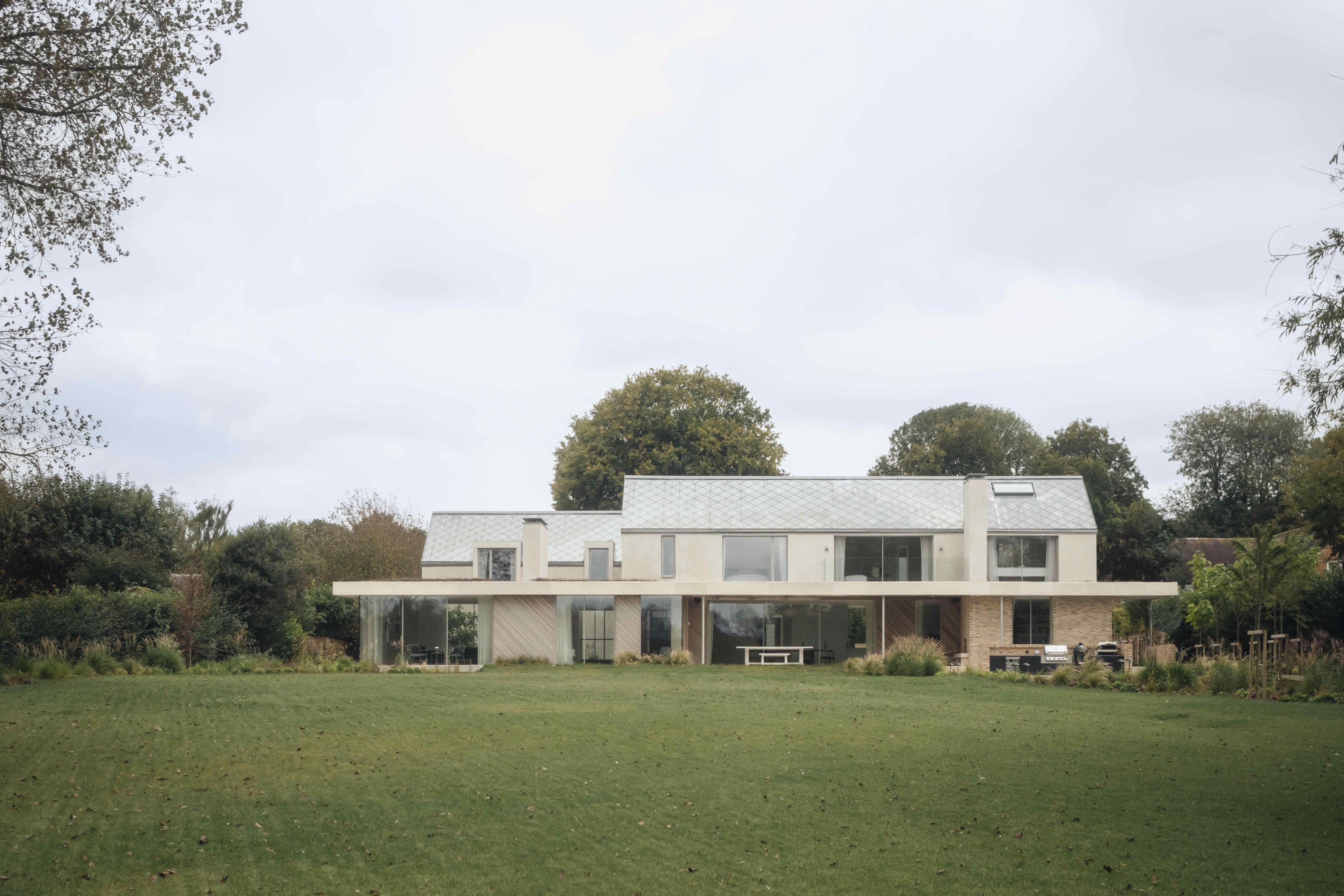 Chalk River House incorporates a steel frame alongside a timber frame to create two volumes connected by a link area, with a double-storey, vertically-sliding guillotine window.