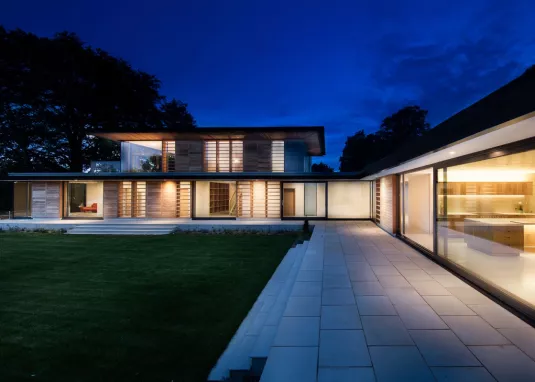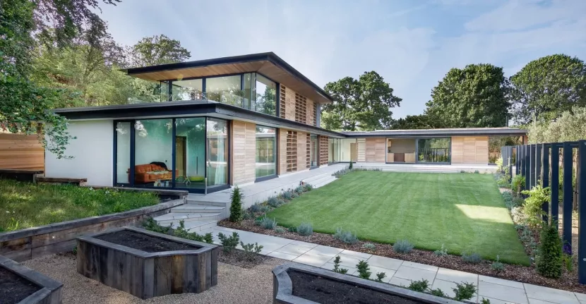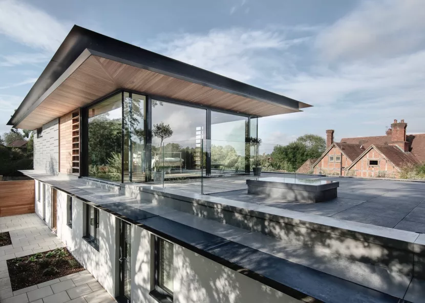A new contemporary home with four bedrooms and open plan living spaces for entertaining, built in the upper garden of Manor Court, a 17th century Grade II listed building which is situated in the South Warnborough Conservation Area.