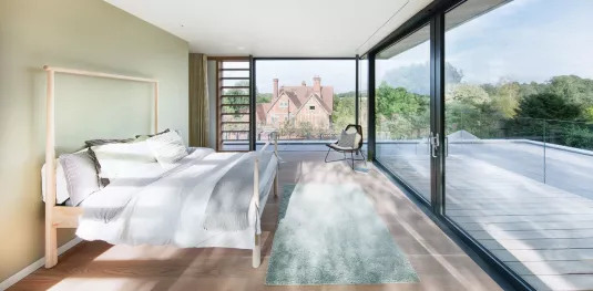 The master bedroom suite at first floor is orientated south and designed with a terrace that takes in the wide views of the countryside.
