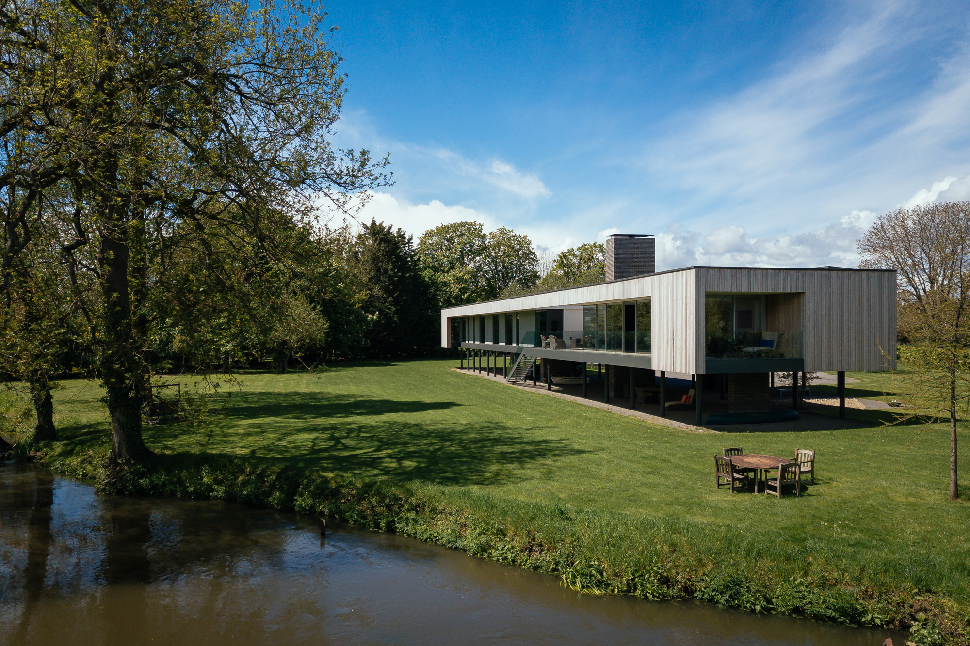 Momentum worked with John Pardey Architects on the design of the private house which is built on supporting columns to raise it 2.2m above the ground, making space for parking but also bringing it above the 1:100 year plus predicted Climate Change, a potential flood depth of 1.17m.