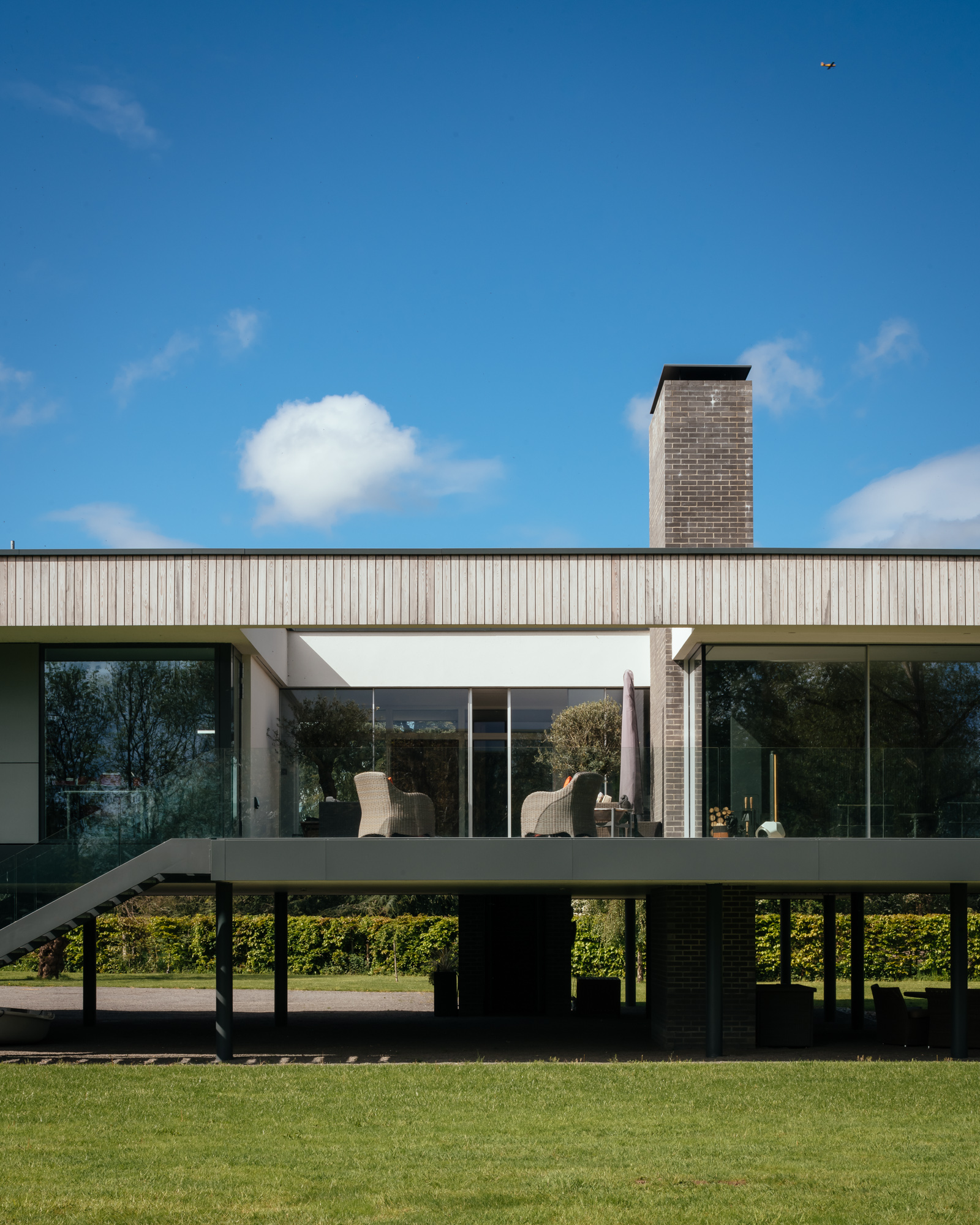 The house has a steel framed structure, infilled with timber framing and insulation, all bearing on piled foundations.