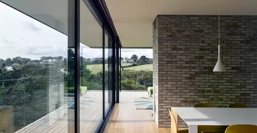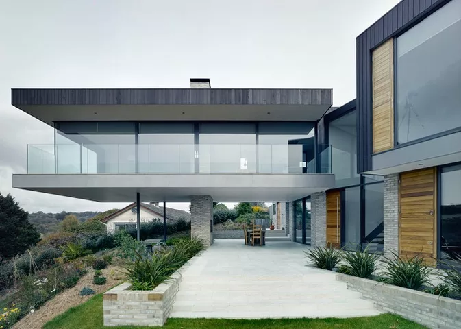 A bridge provides access into a glazed hallway between the two separate living spaces. The living room wing projects out into the site in a dramatic cantilever above the dropping site - so that the living room gains fabulous views out across the estuary.
