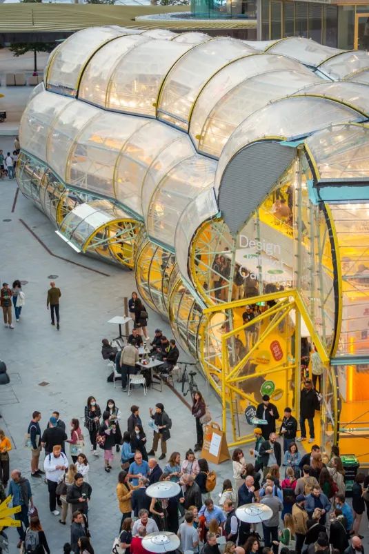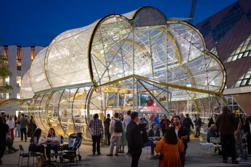 It is a lightweight curved transparent structure with complex geometry, housing bars and restaurants. It comprises 10 curved truss frames, designed as 3 pinned arches, braced apart with lightweight purlins and clad with single ply ETFE reinforced with cables.