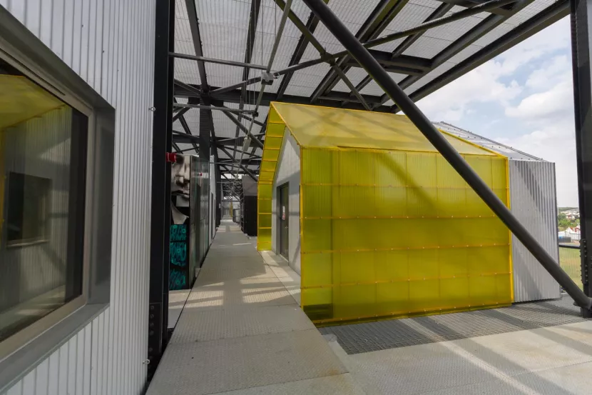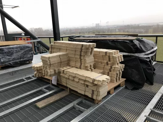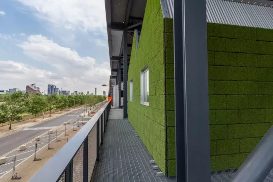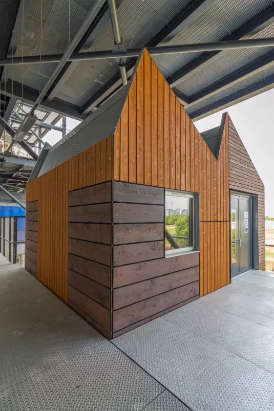 They are housed inside the remaining steel structure that was originally utilised for machinery in the Broadcast Centre for the 2012 Olympics.