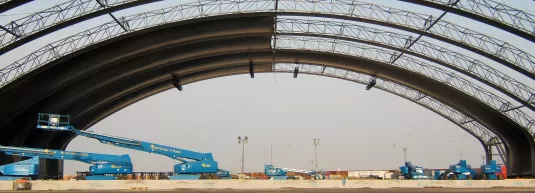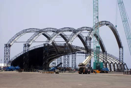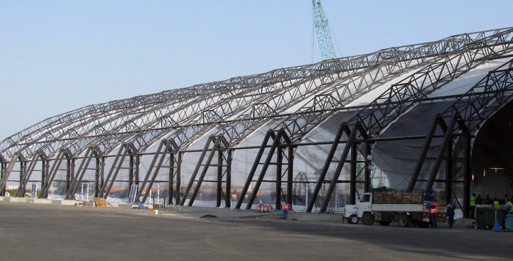 Pavilions were constructed from steel-framed modular truss components clad in fabric. The dining pavilion included a 13m-high picture wall running its entire length to allow the King and his guests to enjoy spectacular sunset views during dinner.