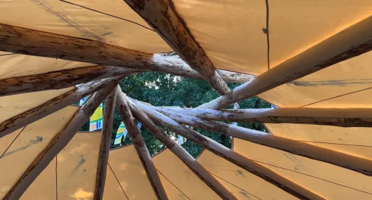 The Living tree was built using sweet chestnut round poles in a double reciprocal array, working in collaboration with artists Andrew Amondson and Matthew Leece.
