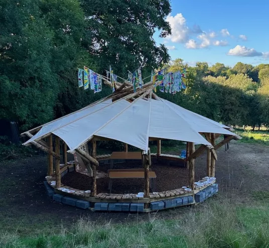 The outdoor classroom is an outdoor learning space with views over the city. The structure is a reciprocal frame roof, built using a mixture of Douglas fir and sweet chestnut in the round.